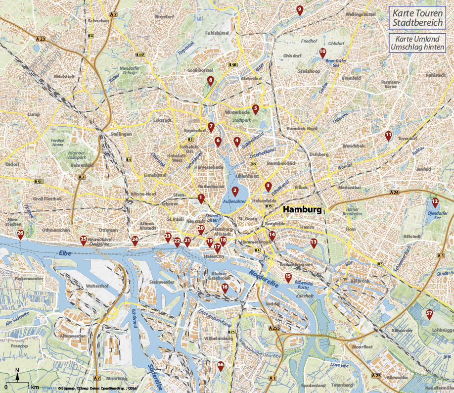 Hamburger Stadtgebiet: Auf der Elbmeile (Altona), Alster und Isebekkanal, Alsterkanäle, Außen- & Binnenalster, Außenmühlenteich mit Midsommerland, Billerhuder Insel, Strandweg Blankenese & Treppenviertel, Elbstrand Blankenese mit Falkensteiner Ufer, Boberger See & Billeniederung, Cap San Diego – Rickmer Rickmers – U-Boot 434, Entenwerder & Elbinsel Kaltehofe, Eppendorfer Moor, Floating Home Hamburg in Hammerbrook, Hafencity, HafenCity RiverBus, Hafenrundfahrt mit der Fähre Linie 62, Öjendorfer See, Övelgönne & Strandperle, Speicherstadt, Stadtpark Winterhude, Hafenmuseum & Veddeler Fischgaststätte, Wandse & Ostender Teich, Wilhelmsburger Inselpark.